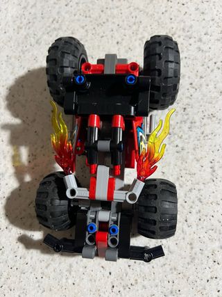 Veicolo Lego con un design accattivante e dettagli a forma di fiamme. - Ruote grandi per terreni difficili. - Dettagli rossi e grigi. - Elementi trasparenti arancioni e gialli che simulano le fiamme.