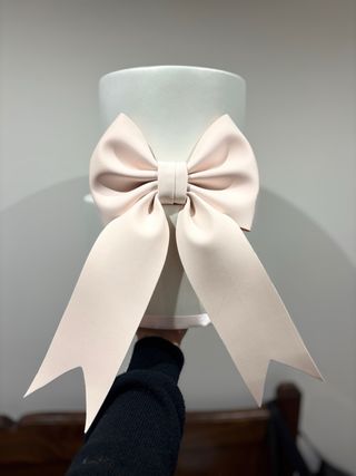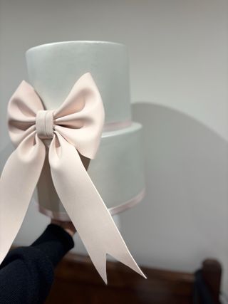 Torta scenografica decorata con un grande fiocco. - Fiocco in gomma eva fatto a mano, color rosa cipria. - Base bianca e liscia.