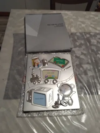 Deliziosa cornice portafoto a tema bimbi, perfetta per conservare i ricordi più dolci. - Design a forma di trenino con orsetto. - Include spazi per più foto. - Materiale in metallo argentato.