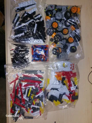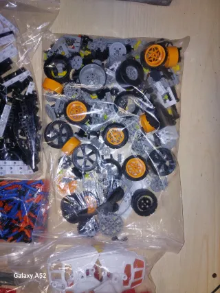 Lotto misto di pezzi per costruzioni. - Pezzi di varie forme e colori. - Include ruote, ingranaggi e elementi strutturali.