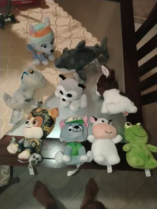 Peluche assortiti: cane, squalo, dinosauro, conigl