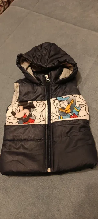 Lotto di vestiti per neonato, taglia 9-12 mesi. - Giacca imbottita con stampa Topolino - Pantaloni blu scuro con laccetti - Pantaloni marrone scuro - Maglietta gialla con scritta FUNNY - Tuta azzurra con stampa orsetto - 2 Body con la manica lunga.