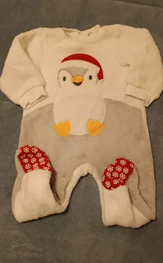 Lotto di vestiti per neonato, taglia 6-9 mesi. - Pantaloni e camicia blu scuro. Nuovo. - Maglietta arancione. - Pantaloni neri. - Felpa grigia. - Body a righe verdi e bianche. - Tuta bianca calda con applicazione di pinguino natalizio. - Cappellino nero con interno in pelliccia.