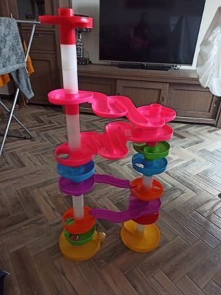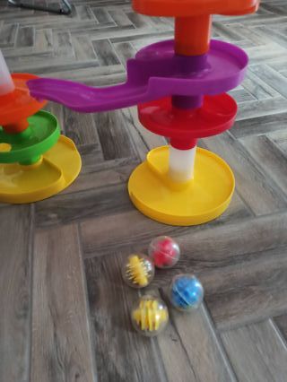 Pista biglie grandi sensoriale in buone condizioni come da foto. Gioco educativo STEM per bimbi dai 9 mesi in su, include 4 palline colorate con diverse texture. Privo di scatola originale, perfetto per sviluppare coordinazione e vista. Struttura stabile e colorata.