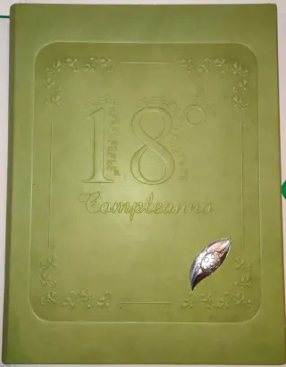 Album per foto in occasione del 18° compleanno. La copertina è di colore verde chiaro con decorazioni floreali in rilievo. - 18° Compleanno inciso sulla copertina. - Dettaglio decorativo a forma di foglia in argento applicato.