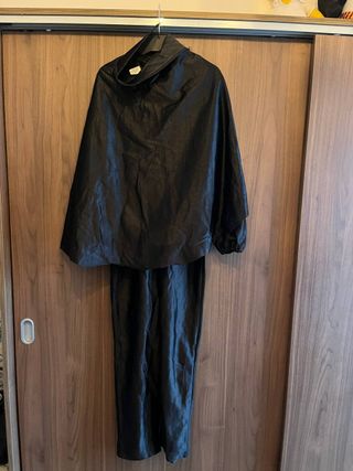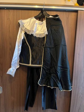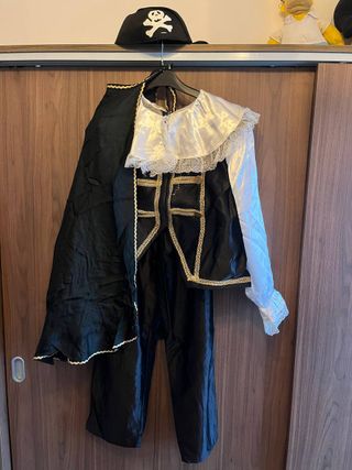 Costume da pirata per bambino, ottime condizioni, usato poche volte. Taglia 9/10 anni. Include: - Cappello nero con teschio. - Casacca nera con dettagli dorati, - Pantaloni neri - Mantello nero. Misure: -Larghezza spalle 33cm -Lunghezza dalla spalla alla vita 49cm -Larghezza torace 43cm -Lunghezza dalla vita alla caviglia 83cm -Lunghezza mantello: crica 76 cm 100% poliestere