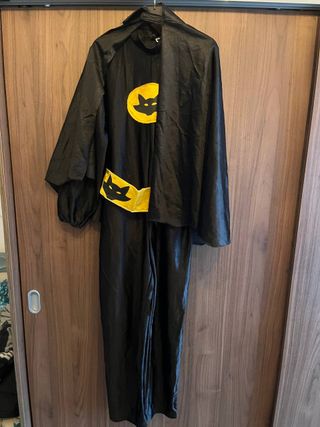 Costume da bambino per il carnevale, ispirato a batman. Taglia 8/10 anni. Include: - Completo nero con apertura posteriore e dettagli gialli - Mantello, tuta e cintura. - Simbolo giallo sul petto e sulla cintura. - Mascherina nera. Misure: -Lunghezza di tutto il completo, da spalla a caviglia: circa 1,20 m. -Larghezza spalle 36cm -Larghezza torace 43cm -Larghezza vita: 39 cm -Lunghezza mantello 56cm. Materiale: 100% poliestere.