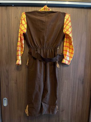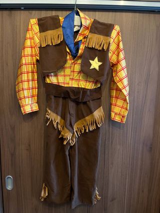 Costume da sceriffo per bambino, perfetto per il carnevale o feste a tema. Si tratta di un costume completo con apertura anteriore. Taglia 4/6 anni. Include: - Camicia a quadri gialla e rossa. - Gilet marrone con frange e stella. - Pantaloni marroni con frange. - Foulard blu. Misure: - Lunghezza da spalla a caviglia: 93cm - Larghezza spalle: 35 cm - Larghezza vita: 31 cm 100% poliestere