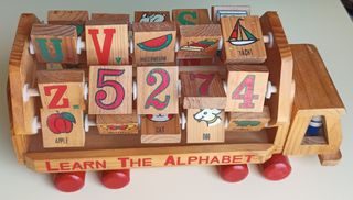 Camion Giocattolo in Legno con tessere rotanti raffiguranti Lettere e Figurine. Giocattolo Vintage. 8 ruote in legno rosso e l'intero blocco del carico girevole. Dimensioni: 30x11x16 cm. Questo articolo affascinante non può mancare in una qualsiasi collezione di giocattoli. Ideale sia per il collezionista di giocattoli retro sia per il genitore alla ricerca di un nuovo balocco per il suo piccolino.
