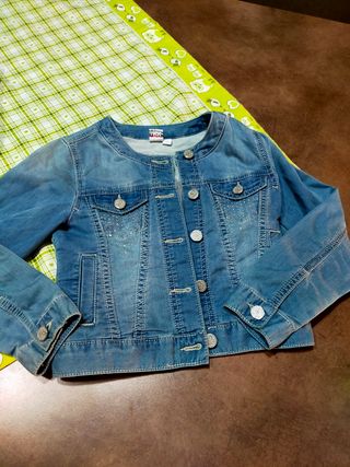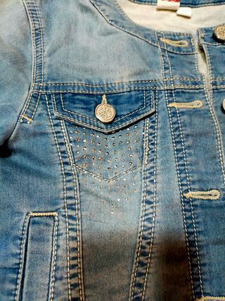 Bellissimo giubbotto di jeans per bambina, perfetto per la primavera o l'autunno. - Ottimo stato. - Colore: blu chiaro. - Dettagli con strass. - Chiusura con bottoni.