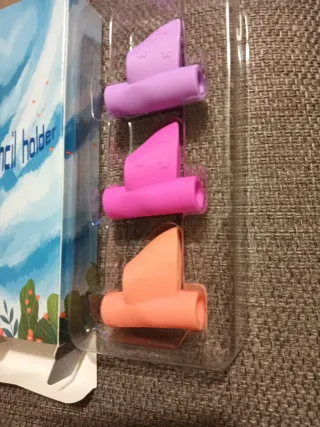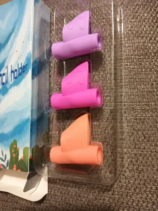 Set di 3 impugnature per matita, ideali per aiutare i bambini a scrivere correttamente. - Colori assortiti: viola, rosa e arancione. - Design ergonomico a forma di barchetta. - Materiale in silicone morbido.