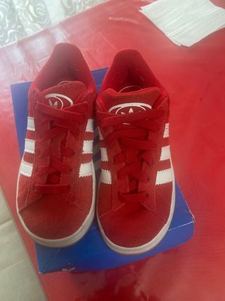 Scarpe Adidas Campus per bambini. - Colore rosso vivace. - Materiale scamosciato. - Iconiche strisce bianche. - Chiusura con lacci rossi.