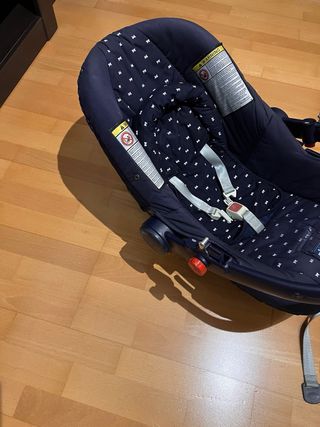 Seggiolino auto per neonati della marca Chicco. Progettato per offrire sicurezza e comfort. Colore blu navy. Base in plastica resistente.