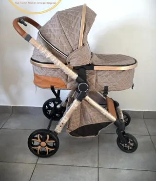Passeggino per neonati con un design moderno ed elegante. - Carrozzina spaziosa e confortevole. - Struttura metallica in tonalità dorata. - Tessuto esterno color grigio jaspé. - Tetto regolabile con ventilazione.