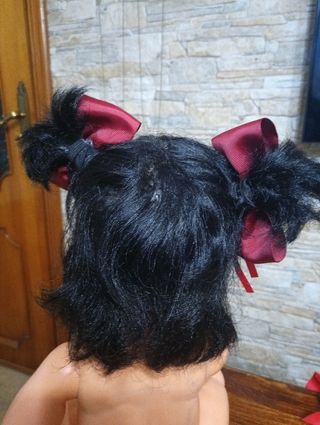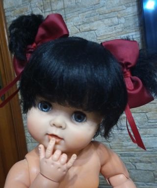 Vendo parrucca vintage per bambola di 50/ 60 cm con circonferenza testa 36,5/ 38 cm, con tutti i fiocchi presenti nelle foto. Le bambole non sono comprese. I capelli della parrucca nonostante non siano di altissima qualità godono di ottima salute. La calotta è in plastica leggermente elastica e può essere incollata direttamente sulla bambola (io lo sconsiglio). Alla base della calotta ci sono tutto intorno dei ciuffetti di capelli corti, a nascondere il bordo della parrucca