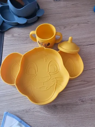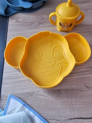 Set pappa a tema Re Leone, perfetto per i più piccoli. Include un piatto e una tazza. - Piatto a forma di Simba. - Tazza con beccuccio e manici. - Colore giallo vivace. In silicone con ventosa
