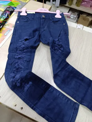 Jeans bimba di colore blu, taglia 10 anni, con un design strappato alla moda. - Vita media. - Chiusura con bottone e zip. - Tasche anteriori e posteriori. - Dettagli strappati sulle gambe.