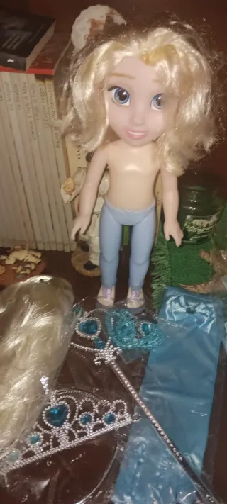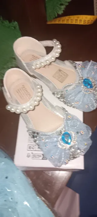 Set di accessori per travestimento ispirato a Frozen. Include una coroncina scintillante, una bacchetta magica e una collana Scarpe n24 Parrucca Bambola - Corona con gemme azzurre. - Bacchetta magica decorata. - Collana con ciondolo a cuore.