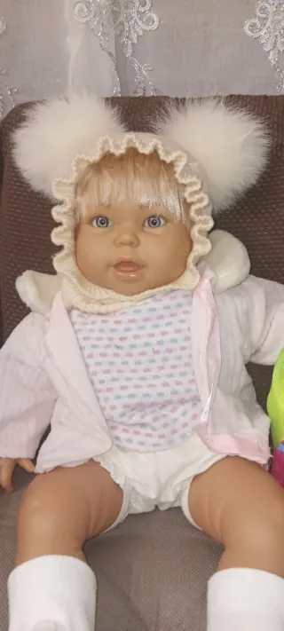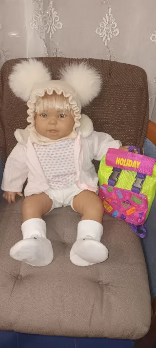 Bambola in ottime condizioni, pronta per nuove avventure. - Cappellino bianco con pompon. - Completo con maglietta, giacca e pantaloncini. - Calzini bianchi. - Zainetto colorato con scritta HOLIDAY. Ha solo una scritta mezza cancellata sul braccio
