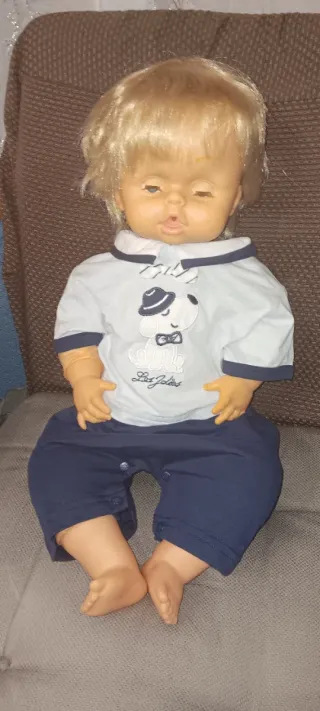 Bambola Cicciobello vintage, un classico intramontabile. - Capelli biondi. - Indossa una tutina blu con dettagli bianchi e un disegno di un cane con cappello. - Dettagli del viso tipici del modello. Bottone sulla pancia