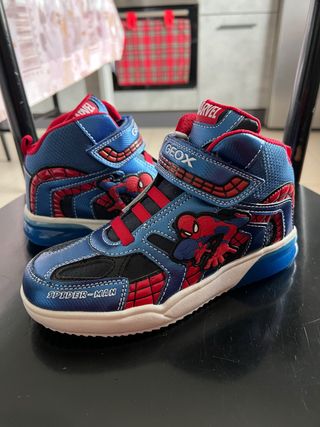 Scarpe alte Geox per bambino con tema Spiderman. - Design a tema Marvel. - Chiusura con strappo. - Dettagli a contrasto rosso e blu. - Logo Geox sulla linguetta. - Scritta SPIDER-MAN sul lato. Accensione luci Nuove mai indossate Numero 33