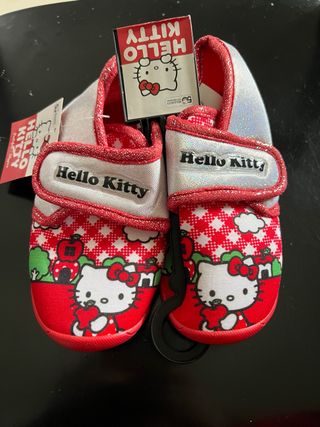 Carine pantofole per bambina con il personaggio di Hello Kitty. - Fantasia a quadretti rossi e bianchi. - Immagine di Hello Kitty con una mela. - Chiusura a velcro. - Dettagli glitter rossi.