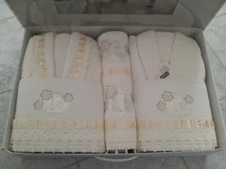 NUOVO SET COMPLETO BAGNO 8PZ 2 ACCAPPATOIO 2ASCIUGAMANI VISO 2ASCIUGAMANI OSPITI 2 MANOPOLE 100%SPUGNA DI COTONE PANNA CON PIZZO ECCELLENTE QUALITÀ SUPER OFFERTISSIMA