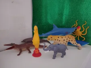 Set di animali e pesci in plastica, ideale per collezionisti o per gioco. - Include un coccodrillo, un delfino, un cavalluccio marino, un elefante, un ghepardo, due squali e un polpo. - Realizzati in plastica colorata.
