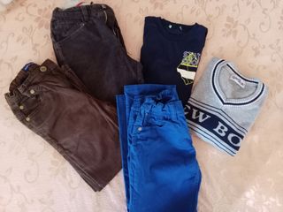 Set composto da tre capi per bambino. Marca Original Marines e Benetton - 2 Pantaloni marroni. -1 Pantalone blu. - Maglietta blu con stampa. - Maglioncino grigio con scollo a V.