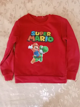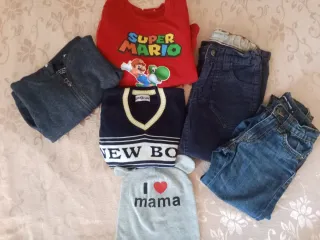 Set di abbigliamento per bambino composto da diversi capi. - Felpa rossa con stampa Super Mario e Yoshi. - Maglioncino blu navy con scollo a V e scritta NEW BO. Felpina con zip Primark - Pantalone blu scuro. - Jeans blu Original Marines - Cappellino scritta I ❤️ mama.