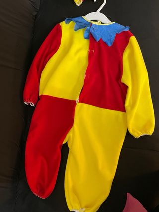 Costume da pagliaccio colorato, completo di cappello a punta. Perfetto per feste e travestimenti. - Tuta intera con maniche lunghe. - Fantasia a pannelli rossi e gialli. - Collo a jabot blu. - Dettagli a rombo blu sulla gamba. - Bottoni verdi decorativi sul petto. - Cappello a punta abbinato.