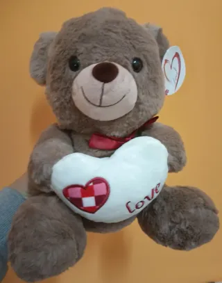 Orsetto di peluche marrone, perfetto per San Valentino. Tiene un fiocco rosso al collo e tiene in mano un morbido cuore bianco. - Cuore bianco con disegno a scacchi rossi e rosa. - Scritta love ricamata sul cuore.