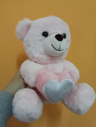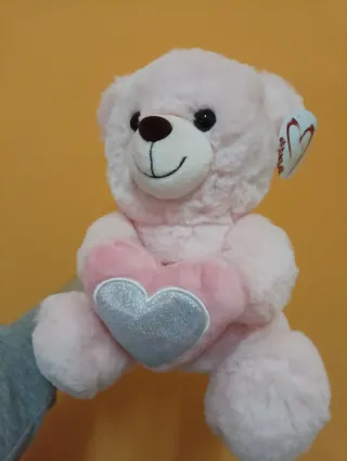 Orsetto di peluche rosa, perfetto per San Valentino. Tiene un cuore argentato scintillante tra le zampe. - Colore: Rosa - Dettaglio: Cuore argentato glitterato - Materiale: Peluche morbido