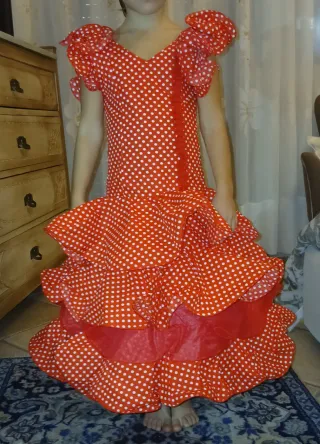 Bellissimo vestito da bambina per carnevale o feste a tema spagnolo. Il vestito è rosso a pois bianchi con balze. - Fantasia a pois bianchi su sfondo rosso. - Maniche a sbuffo. - Ampie balze sulla gonna.