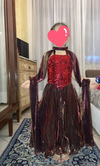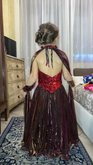 Costume da bambina per Carnevale, perfetto per interpretare una Regina dei Vampiri. Adatto per età dai 5 ai 7 anni. - Corpetto rosso scintillante di paillettes. - Gonna lunga e fluida in tessuto cangiante. - Mantellina con maniche ampie e sciarpa coordinata al collo.