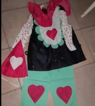 Costume da Regina di Cuori per bambina, perfetto per il Carnevale. - Gonna verde acqua con cuori rossi. - Corpetto nero con grembiule bianco e cuore rosso. - Maniche bianche a pois rossi. - Cappello a punta rosso con cuore bianco.