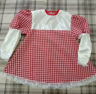 Costume da Cappuccetto Rosso per bambina, adatto per età 3-4 anni. Perfetto per feste di carnevale o recite. - Vestito con mantella rossa e cappuccio. - Gonna a quadri rossi e bianchi. - Maniche bianche a sbuffo. - Dettagli floreali applicati sulla mantella. - Orlo con pizzo bianco.