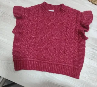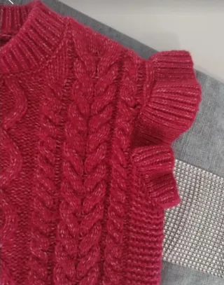 Gilet in maglia per bambina con dettagli a trecce e volant sulle spalle. Perfetto per aggiungere un tocco di stile. - Colore: rosso - Materiale: maglia morbida - Design: trecce frontali - Dettagli: volant sulle maniche corte