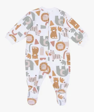 Tutina per neonato con una divertente fantasia a tema giungla. - Fantasia con leoni, elefanti, tigri e altri animali. - Colori tenui e design giocoso. - Chiusura con bottoncini sul davanti.