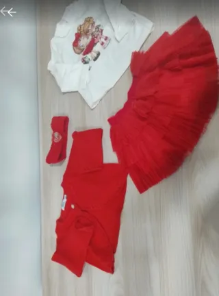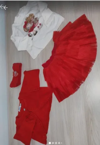 Set composto da diversi capi per neonata. - Maglietta bianca con stampa. - Tutù rosso. - Body rosso. - Fascia per capelli rossa con decorazione.
