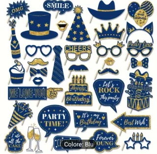 Set di accessori per feste di compleanno a tema blu e oro. - Include cappello, occhiali, baffi, labbra, cravatta, torta, palloncini, bottiglia, bicchieri, cono festa, fumetti con scritte. - Scritte presenti: OMG, SMILE, CHEERS, WE LOVE YOU, Happy Birthday, Let's ROCK This party, BIG SURPRISE, PARTY TIME!, It's my Birthday, Best Wish, Forever YOUNG, I ate all the CAKE. - Colore: Blu e Oro.