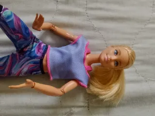 Bambola Barbie con un completo sportivo. - Top viola con bordi rosa. - Pantaloni con fantasia astratta blu e rosa. - Dettagli neri sulle ginocchia e sui fianchi.