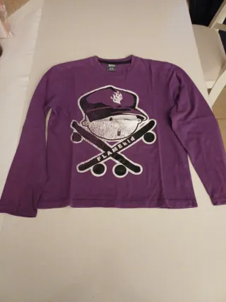 Maglia a maniche lunghe per bambino di colore viola. - Stampa grafica sul davanti con cappellino e skateboard. - Scritta FLAMEKID sulla stampa.