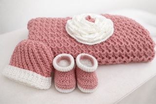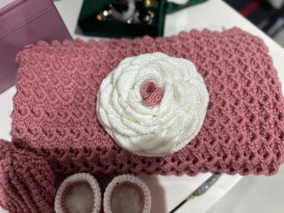 Set nascita in lana rosa e bianca, lavorato all'uncinetto. Include cappellino, scarpine e copertina decorata con un fiore. - Cappellino con bordo bianco. - Scarpine con bordo bianco. - Copertina con motivo a rombi e fiore bianco applicato. Su ordinazione