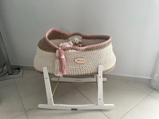 Culla in maglia fatta a mano, perfetta per accogliere il tuo neonato. Il design a righe nei toni del bianco, beige e rosa la rende un elemento d'arredo unico. - Realizzata in morbida maglia. - Decorata con nappine colorate. - Include una targhetta in legno personalizzabile con il nome del bambino., inclusa di base di legno e supporto a dondolo Ps su richiesta e prenotazione