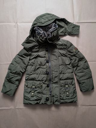 Piumino da bambina di colore verde militare con pelo nel cappuccio. Cappuccio staccabile e doppia allacciatura. Marca: Peuterey. Taglia: 6Y. 6 Anni. S. Composizione: 100% Poliestere. Fodera: 100% Poliestere. Pelliccia ecologica: 87% Modacrilica, 13% Poliestere. Imbottitura: Piuma d'anatra. Ampiezza spalle: 35 cm. Lunghezza: 54 cm.