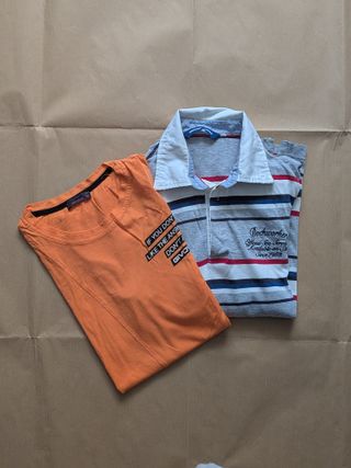 Set polo e t-shirt da ragazzo. Usate ma in ottime condizioni. Non presentano difetti. Polo. Marca: Original Marines. Ampiezza spalle: 37 cm. Lunghezza: 60 cm. Maglietta arancione. Marca: Givova. Taglia: 16 anni. Composizione: 100% Cotone. Ampiezza spalle: 39 cm. Lunghezza: 62 cm.