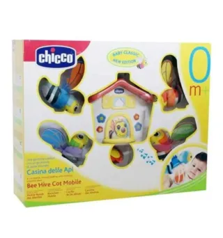 Giostrina musicale per culla Chicco Casina delle Api. - Design a tema casetta delle api. - Include personaggi a forma di ape. - Adatta per neonati (0m+). - confezione originale