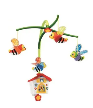 Le apine colorate girano e volano al ritmo della musica di una ninna nanna. Può essere facilmente fissata al lettino grazie all'apposito supporto regolabile. La casetta musicale può essere staccata dal corpo centrale ed essere utilizzata separatamente come carillon.