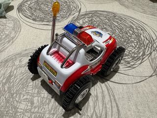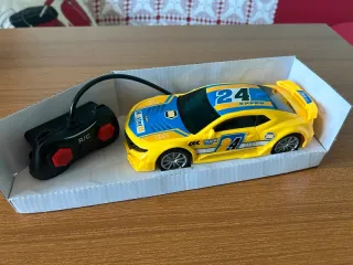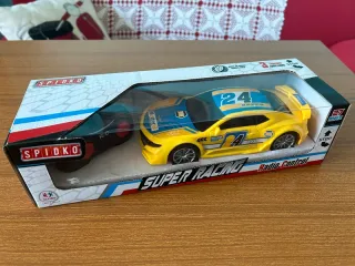 Modellino macchina telecomandata di colore giallo e blu, in plastica. Lunghezza 18 cm, larghezza 8 cm. La macchina funziona con 3 pile di tipo AA; il telecomando funziona con 2 pile di tipo AA. Pile non incluse. Completo di scatola originale, mai usato.